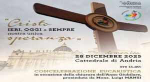 Domenica 28 dicembre tutta la comunità diocesana si incontra per la chiusura dell’Anno Giubilare “Pellegrini di Speranza”. Per l’occasione, alle ore 11.30, in Cattedrale ci sarà la celebrazione Eucaristica presieduta dal Vescovo Mons. Luigi Mansi, con la partecipazione di tutte le comunità parrocchiali, dei religiosi e delle religiose, delle associazioni e dei movimenti, e delle Autorità civili e militari della…