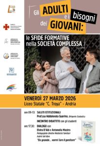 Venerdì 27 marzo presso il Liceo Statale Carlo Troya, ci sarà una giornata dedicata al tema del rapporto tra adulti e ragazzi dal titolo Gli adulti e i bisogni dei giovani: le sfide formative nella società complessa. Al mattino dalle ore 9.00 alle ore 13.00 ci sarà il saluto del Dirigente Scolastico e l’incontro dibattito con gli studenti, e nel pomeriggio alle ore 17.30 il dialogo con Elvira D’Alò e Antonella Mastro Pedagogiste cliniche e mediatrici familiari, nonché autrici del libro “Da grande vorrei fare il genitore”. Questo convegno costituisce un interessante momento di ascolto e dibattito su tematiche attuali che toccano la realtà dei giovani e il mondo degli adulti.