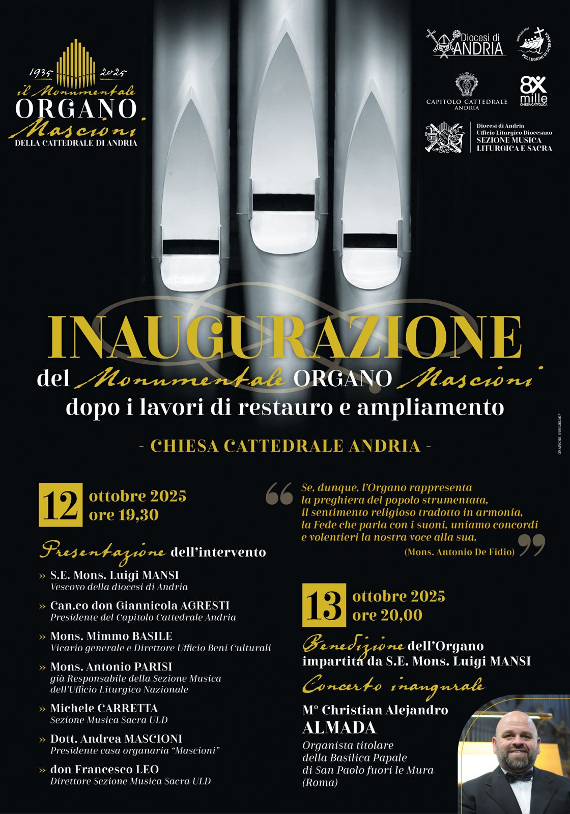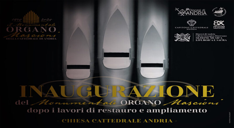 Grande festa e gioia, domenica 12 alle ore 19:30 e lunedì 13 ottobre 2025 alle ore 20:00 nella Cattedrale di Andria, due giorni dedicati all’inaugurazione, dopo l’impegnativo intervento di restauro e ampliamento a cura della ditta Mascioni, del monumentale organo della Chiesa Cattedrale.