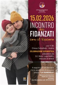La Diocesi di Andria, vivrà il suo consueto appuntamento celebrativo con i fidanzati presieduto dal nostro vescovo. Sarà occasione per convergere in un momento comunitario dei vari gruppi presenti nella nostra Chiesa locale e che sono in cammino di preparazione verso il matrimonio.