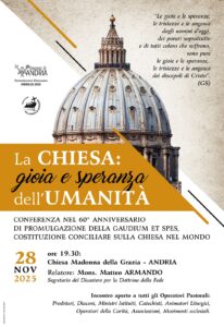 Questa sera alle ore 19.30, presso la parrocchia della Madonna della Grazia in Andria si parlerà di Concilio Vaticano II e in particolare della Gaudium et Spes, la Costituzione sulla Chiesa e sul mondo contemporaneo che compie 60 anni dalla sua promulgazione. A guidare la conferenza sarà Mons. Armando Matteo, Segretario del Dicastero per la Dottrina della Fede.