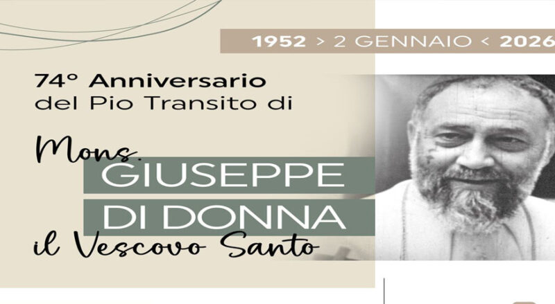 Il 2 Gennaio ricorre il 74 mo anniversario del pio Transito del Venerabile Mons. Di Donna, in questa occasione ci sarà una Celebrazione Eucaristica in Cattedrale alle ore 18.30 presieduta da Mons. Giuseppe Favale Vescovo della Diocesi di Conversano – Monopoli, e concelebrata dal Vescovo di Andria Mons. Luigi Mansi e dai sacerdoti. Come da consuetudine presso la tomba del venerabile ci sarà anche l’omaggio floreale dei fedeli di Rutigliano e l’accensione della lampada da parte dei devoti della Diocesi di Andria. Venerdì 9 gennaio invece presso la Chiesa del Carmine in Andria, alle ore 20.00 ci sarà l’Adorazione Eucaristica con i testi del venerabile.