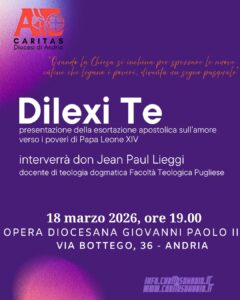 Il giorno 18 marzo alle ore 19.00 presso l’Opera Diocesana “Giovanni Paolo II”, don Jean Paul Lieggi ,docente di teologia dogmatica presso la Facoltà Teologica Pugliese, presenterà l’Esortazione Apostolica di Papa Leone XIV “Dilexi Te” sull’amore per i poveri. L’iniziativa è a cura della Caritas Diocesana, tutta la comunità è invitata.